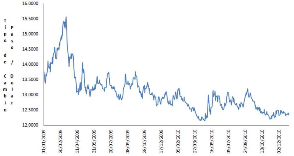 En la Grafica 5 se muestra la serie histórica del tipo de cambio en el periodo de enero 2009 a diciembre 2010 de forma diaria. El valor máximo del tipo de cambio fue de 15.5668 alcanzado en inicios de marzo de 2009 y el mínimo que se encontró finales de abril de 2009 y fue de 12.1519. Tras alcanzar el valor de 15.5668, el tipo de cambio empieza a disminuir, pero no alcanza a regresar a valores de 10 pesos que tenía antes de la crisis del 2008.