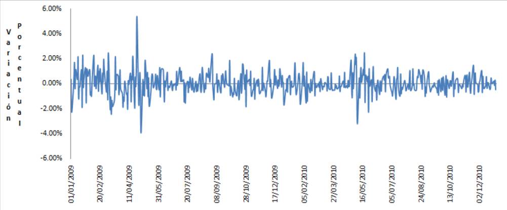 En la Gráfica 6, se puede observar la variación de los movimientos en el tipo de cambio del año 2009 al año 2010. Se presenta de nuevo volatilidad en el tipo de cambio a inicios del 2009 donde las bandas de las variaciones en más amplia que en el resto del periodo.