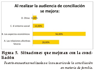 Las figuras 4 y 5 demuestran la falta de cultura hacia la conciliación. Se realizó encuestas a diferentes personas naturales que acudían a la conciliación de conflictos en materia de familia. El 35% afirmó que el acuerdo conciliatorio enmarcaba un negocio jurídico y que plantea un mejoramiento de los ingresos económicos y no es visto como un evento de resarcimiento familiar. De la figura 5, los usuarios afirman que la conciliación, mejora los aspectos económicos de los usuarios con un 56%; seguido de las relaciones afectivas futuras con un 28%.