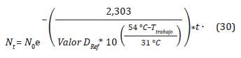 En la Tabla 5 se presentan los Valores D encontrados con la Ecuación 24, estos valores son muy cercanos a los reportados por Agalloco & Carleton (2007) para las concentraciones de referencia a 300, 450 y 750 ppm, y temperaturas de trabajo 40, 54, 60 2C sobre Bacillus arthophaeus ATTC # 9372.