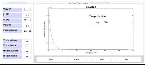 Figura 3 Interfaz gráfica en MATLAB para la determinación del ciclo de esterilización con OE a T trabajo = 55 °C