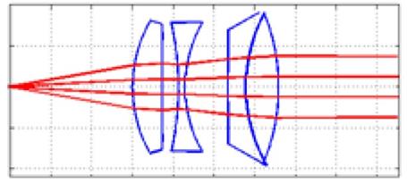 En la segunda, el dispositivo Tessar, descrito matricialmente en la Tabla 2, es expuesto gráficamente en la Figura 10. El sistema puede verse como una fuente puntual de luz que se propaga de izquierda a derecha atravesando un sistema óptico, generando a la salida de este un conjunto de rayos que se propagan hacia el infinito en forma paralela.