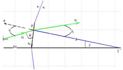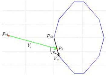 El punto de incidencia del rayo con la lente es calculado mediante la intersección de dos vectores. Uno de ellos, el vector V s , es tangente a la superficie de la lente con el origen en p v2 como se escribe paramétricamente en la Ecuación (7), es construido por dos puntos sucesivos del conjunto de puntos que definen la lente, planteado en la sección I. EL otro vector Vi con origen p v1 , descrito paramétricamente por la Ecuación (8) (Mortenson, 1999) representa al rayo incidente como lo muestra la Figura 4.