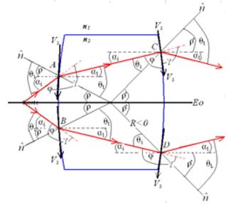 La propagación del rayo dentro de la lente el vector refractado en la primera superficie hace las veces de el vector incidente de la segunda superficie, en la cual el rayo emerge de la lente. Este procedimiento hace posible generalizar el cálculo de los vectores de incidencia y refracción de los rayos que se propagan en un sistema de lentes acoplado.