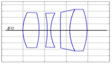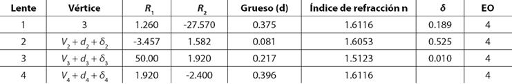 El acople de las lentes es establecido por el vértice de la primera superficie, los radios de curvatura R 1 y R 2, el grueso d, el índice de refracción n, y el eje óptico (EO), en orden sistemático y sucesivo para su localización en el sistema. La Tabla 2 presenta el arreglo matricial del dispositivo Tessar (Hetch, 2005) ilustrado en la Figura 7 compuesto por cuatro lentes ordenados secuencialmente sobre el eje óptico en la dirección de x. En la matriz, las lentes son ordenadas en filas y ordenadas en una secuencia que inicia de la parte superior de la matriz. Los parámetros de la segunda lente están en la segunda fila y así en sucesión hasta el final de la tabla. La primera columna presenta el valor de la coordenada x del vértice de la primera superficie de la lente, la segunda columna contiene el valor del radio de curvatura de la primera superficie, R 1, la tercera columna contiene el radio de la segunda superficie R2; en la cuarta columna, el valor del grueso de la lente, la quinta contiene el índice de refracción n. El parámetro δ denota la distancia de separación entre el vértice de la segunda superficie con el vértice de la primera superficie del lente a continuación y la última columna indica la coordenada y del eje óptico.