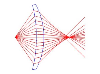 Para exhibición de la funcionalidad del esquema expuesto en este informe se han modelado tres situaciones: La primera ilustrada en la Figura 9 presenta el modelo de trazado de rayos sobre una lente menisco cóncava que es atravesada por un conjunto de rayos. En esta puede verse como no todos los rayos cruzan el eje óptico en el mismo lugar, tal como lo define la aberración esférica.