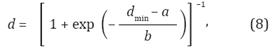 donde a es el valor promedio entre el máximo y el mínimo y b es el parámetro que controla crecimiento de la función, obteniendo así la expresión explícita para la función de deseabilidad que controla la menor separación entre grupos de experimentación, denotada por d min . Una elección adecuada de los parámetros a y b permite incorporar la restricción de interés que se considere apropiada.