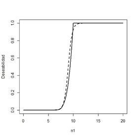 Figura 2 Gráfica de las funciones de deseabilidad d 11(n 1) (línea sólida), definida en (11) y d 12(n 1) (línea punteada), definida en (16).