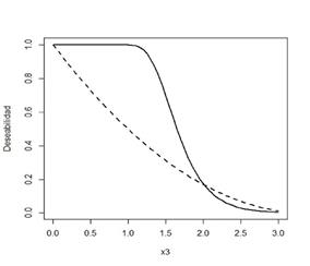 Figura 3 Gráfica de las funciones de deseabilidad d 21(x 3) (línea sólida), definida en (12) y d 22(x 3) (línea punteada), definida en (17).