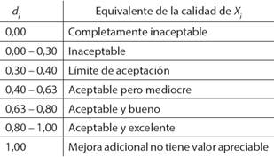 TABLA 1 VERSIÓN ABREVIADA DE LAS DIRECTRICES DE HARRINGTON PARA LA TRANSFORMACIÓN DE LOS NIVELES DE X i , A LA ESCALA DE DESEABILIDAD
