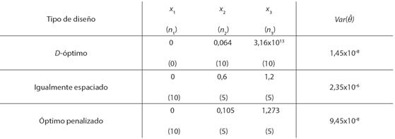 En la Tabla 2 se presentan los 3 diseños experimentales distintos para el modelo de MichaelisMenten, definida en (9) y sus respectivas varianzas de los parámetros estimados. La varianza más pequeña tiene el diseño D-óptimo. El diseño penalizado posee las características prácticas deseadas por el investigador, aunque hay un ligero aumento en la varianza de los parámetros estimados en comparación con el diseño D-óptimo, pero este diseño óptimo penalizado es una mejora en términos de la varianza de los parámetros sobre el diseño de puntos igualmente espaciados elegido arbitrariamente.