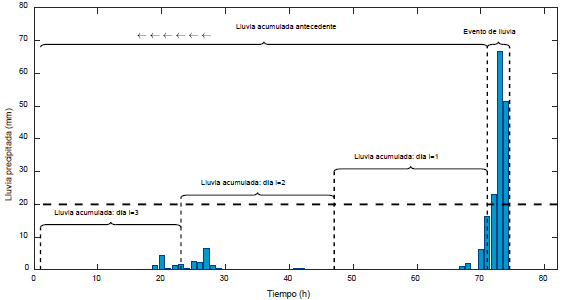 Figura 2 Definición de evento de lluvia (D>1h & I>20 mm) y lluvia acumulada antecedente de 3 días (n=3).