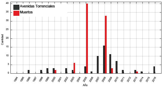 La Figura 3 presenta la distribución anual de los registros de avenidas torrenciales en el Valle de Aburrá entre los años 1994 y 2016, con el número de víctimas registradas. En términos generales se observa un aumento en el número de eventos y víctimas entre los años 2005 y 2011, y un descenso hasta el año 2015. El 2008 corresponde al año con el mayor número de registros de avenidas torrenciales (17) y el segundo año con el mayor número de víctimas registradas (34), solamente superado por el año 2005, cuando se registraron 40 víctimas en tan solo un evento ocurrido el 6 de octubre en la quebrada El Barro del municipio de Bello.