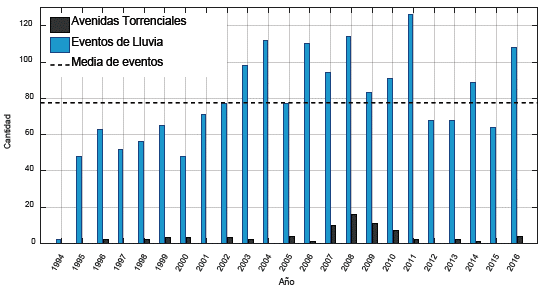 Figura 4 Número de eventos de lluvia (D> 1h & I> 20 mm) registrados en las 15 estaciones analizadas comparado con los registros de avenidas torrenciales en el Valle de Aburrá entre los años 1994 y 2016.