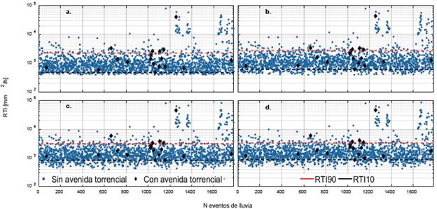 Los eventos de lluvia que presentaron registros de avenidas torrenciales corresponden a valores promedios del RTI, entre 3.701 y 4.774 mm2/h, con un valor extremo de 46.829 mm2/h que corresponde al evento del 30 de noviembre del 2010 ocurrido en la zona urbana de La Sierra (Este del Valle de Aburrá) y que registró 50 viviendas afectadas. El evento con más afectaciones presenta un RTI de 3.657 mm2/h ocurrido el 21 de agosto de 2008 con un saldo de 102 viviendas afectadas, 1.000 personas afectadas y una persona muerta. Existe una gran cantidad de eventos de lluvia, con valores de RTI por encima de 48.203 mm2/h que no tienen registros de avenidas torrenciales.