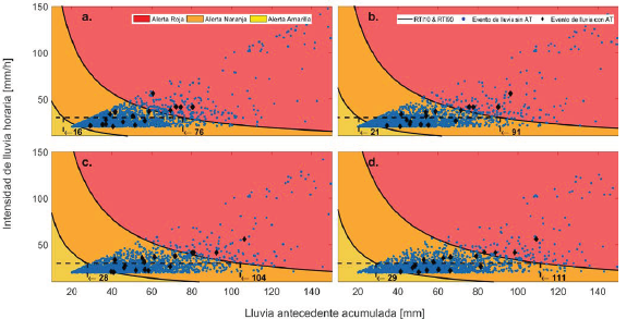 Figura 6 Umbrales de lluvia RTI propuestos para avenidas torrenciales en el Valle de Aburra, en función de la intensidad horaria de lluvia y la lluvia antecedente acumulada, considerando eventos de lluvia con D> 1h & I> 20 mm/h y días de lluvia antecedente acumulada, a) n=1 día, b) n=3 días, c) n= 7 días, y d) n= 15 días.
