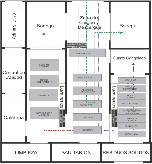 En este diseño de instalaciones (Figura 2) se observa que existe un acceso central que comienza con la "zona de cargue y descargue" y termina con el "escaldado", estas son las actividades mixta de los procesos de despulpado y deshidratado; también se aprecia que hay tres líneas punteadas que toman sentidos diferentes, la azul, representa la secuencia que sigue el mango por las diferentes actividades hasta su conservación como pulpa de mango en el cuarto congelado a una temperatura de -4°C - 2°C; la roja, muestra el recorrido que realiza la berenjena y el ají, para ser guardados en la bodega como rodajas de berenjena deshidratada y ají en polvo (productos terminados); y la línea verde, que llega hasta pesaje final y se dirige a bodega, hace alusión a la materia prima que ingresa a la empresa, pero al no necesitarse en el momento se guarda hasta la próxima producción.