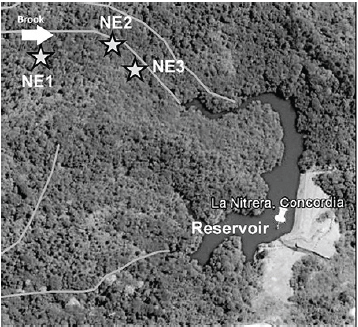 The fieldwork was carried out throughout 7 visits to the La Nitrera nature reserve, such activities were carried out between different months in 2016, 2017, and 2018. The location of the Station 1 (NE1), Station 2 (NE2) and Station 3 (NE3) is shown in Figure 1.