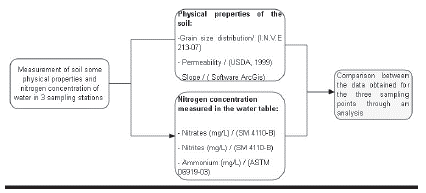 The slope of the ground becomes important to explain the nitrate concentrations in the water phreatic level. Because due to the variability provided by the spatial dimension in the analysis of nitrate ions, it is suggested that the variability in nitrates cannot be explained by the soil grain size distribution of each station due to evidenced soil homogeneity in the three sampling stations. Therefore, the slope and the speed of infiltration are the variables that help to explain the flow of nitrates from the soil pro-file, since they are closely related to their loss due to runoff and infiltration.