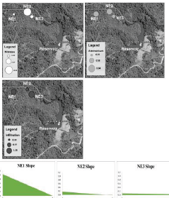 The cross-section in Figure 4 shows the sloping ground of each sampling point, where station 1 (NE1) presented the lowest concentration of nitrates and presented the highest ground slope of the three sampling sites. Therefore, it is inferred that the Nitrates on NE1 are easily carried away by the water runoff and it's accumulated at NE2 where the slope decreases significantly. However, in NE2 and NE3 an inclination of 0.5 ° is reached, which could indicate that between these stations the nitrate washing due to runoff is not very significant due to the decrease in the ground slope. Therefore, the above explains the tendency of nitrates to concentrate on station 2 more than in the other stations, as illustrated in Figure 4.