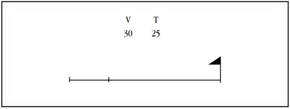 E: “En esta situación el niño puso velocidad 30 y tiempo 25 y al poner esos valores la barra se le movió hasta acá (el entrevistador señala la rayita indicada en la gráfica). Si te dijera que en un segundo intento tendrías que poner los valores para que llegue a la meta, o por lo menos lo más cercano a la meta ¿qué valores pondrías?”. Se busca identificar si el resolutor establece relaciones entre la distancia recorrida con la totalidad de la distancia a recorrer para determinar los valores de V y T y el tipo de relación.