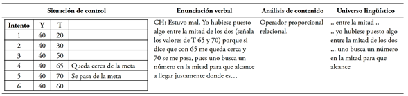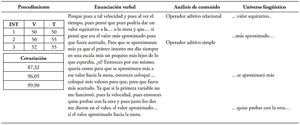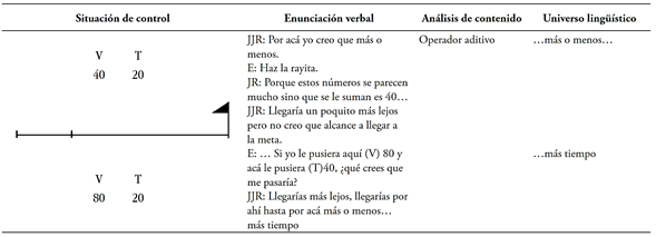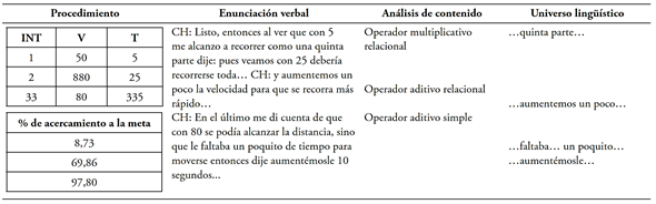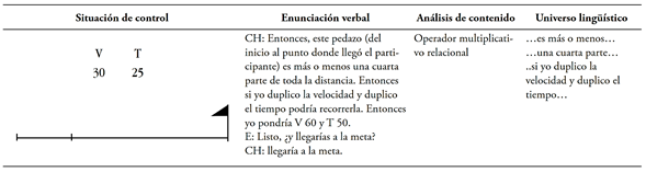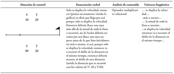 En las oraciones se evidencia el uso de frases relacionales: “entonces si yo duplico la velocidad y duplico el tiempo...” Si bien el procedimiento fue evaluado como no control y control simple¨, las representaciones verbales de los operadores evidenciados en el análisis de contenido se muestran a un mayor nivel. Sugiere el uso de una significación representacional donde T y V se relacionan bajo diversos operadores aditivos, multiplicativos y proporcionales, según sea la manera más apropiada de solución.