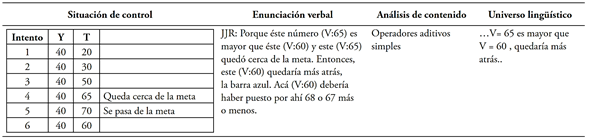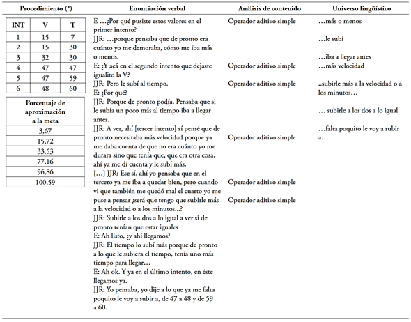 | 1 | JJR: 11;00 (Gº 5) | 6 | dabe (control con alternancia, no control, control simple de dos intentos, cambio controlado) | g (creciente) | R1: cálculos aditivos sin relación entre V y T y sin referir efectos sobre D. |