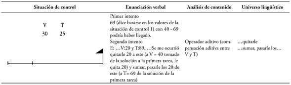 Dadas las restricciones de espacio, se presentan con detalle los resultados de tres de los doce casos estudiados. Estos casos son típicos de los diversos significados representacionales estudiados. En las Tablas 2, 3, 4 y 5 se muestran apartes de la entrevista en términos de las enunciaciones verbales, la inferencia de los operadores matemáticos utilizados y extractos de frases que expresan el universo lingüístico utilizado por los sujetos.