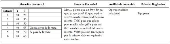En la enunciación verbal general del caso identificado como NE, se encuentran operadores matemáticos aditivos simples y aditivos relacionales. En las oraciones se evidencia el uso de frases que ponen en relación las dos variables de (V) y (T) con respecto a (D). Este caso fue evaluado en su procedimiento en términos del uso de un control con alternancia. Las representaciones verbales que denotan operadores aditivos relacionales son pertinentes con dicho procedimiento. Sugiere el uso de una teoría en la que el sujeto diferencia las variables V y T para producir el efecto deseado.
