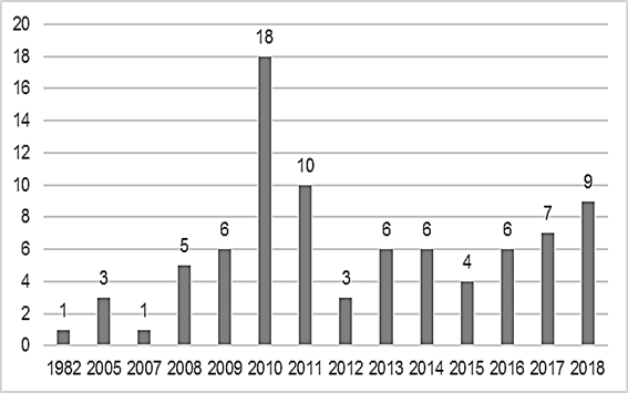 En la Figura 1 se presenta el indicador denominado “cantidad de publicaciones por año”, que muestra un creciente interés por la temática en los últimos años, excepto los años 2012 y 2015. El 2010 es el año de mayor productividad, con 18 publicaciones. Después de este año el número de publicaciones disminuyó, ya que la medición de capacidades de innovación se especializó en sectores e industrias específicos. Entre el periodo 2015- 2018 se evidencia una tendencia creciente en el número de publicaciones, por lo cual se considera que el asunto está cobrando vigencia, pues en esta época en la que se da una mayor competencia provocada por la globalización, las capacidades de innovación tecnológica les permiten a las empresas innovar, un requisito básico para competir de manera efectiva en los mercados.