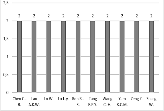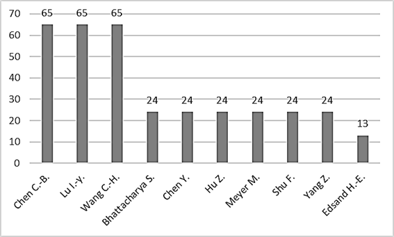 Con respecto a los autores más productivos, se determinó el indicador “cantidad de publicaciones por autor”. En la Figura 2 se pueden observan los diez autores con más publicaciones. Entre los más importantes encontramos a Chiebein Chen, Iuanyuan Lu y Chunhsien Wang, afiliados a diferentes instituciones en Taiwán que han trabajado en conjunto en la publicación de artículos sobre mecanismos para medir las CIT en empresas de alta tecnología, adoptando una medida difusa y un método integral igualmente difuso y no aditivo para medir múltiples variables cuantitativas y cualitativas (Wang et al., 2008).