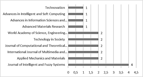 Los resultados de las diez revistas más productivas se presentan en la Figura 3, como indicador de “cantidad de publicaciones por revista”. La revista Journal of Intelligent and Fuzzy Systems es la más importante en términos de cantidad, con cuatro publicaciones. El principal objetivo de esta revista es fomentar los avances en el conocimiento y ayudar a difundir los resultados relacionados con cuestiones como lógica difusa, sistemas inteligentes y aplicaciones basadas en la web. Otras revistas con publicaciones en esta temática son Applied Mechanics and Materials, International Journal of Multimedia and Ubiquitous Engineering, Journal of Computational and Theoretical Nanoscience y Technology In Society, cada una con dos publicaciones. Según lo anterior, las investigaciones sobre las CIT son de interés para revistas de diversas temáticas, por lo tanto los mecanismos para medir las CIT (procesos de análisis jerárquico, sistemas difusos, herramientas sistémicas) se pueden aplicar a diversos campos del conocimiento.