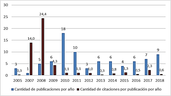 El análisis bibliométrico permite identificar los años con un mayor impacto sobre la materia. En la Figura 4 se muestran los resultados relativos a la cantidad de citaciones por publicación por año. Se observa que los años 2007 y 2008 son de gran impacto en la literatura, con un número promedio de citaciones por publicación de 14,0 y de 24,4 respectivamente.