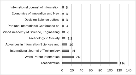 La Figura 6 muestra las diez primeras revistas por cantidad de citación por publicación. La primera de ellas es Technovation, con 116 citaciones para su único artículo Evaluating firm technological innovation capability under uncertainty publicado en el año 2008, que describe un mecanismo para medir las CIT en empresas de alta tecnología utilizando sistemas difusos (Wang et al., 2008). Seguidamente, se tienen World Patent Información, con 24 citaciones para su artículo A patent based evaluation of technological innovation capability in eight economic regions in PR China, en el año 2009. En tercer lugar, se encuentra la revista International Journal of Technology Management con 14 citaciones para su artículo Fuzzy multiattribute analysis for evaluating firm technological innovation capa bility” del año 2007.