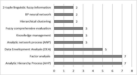 En la Figura 8 se muestran las principales temáticas que arrojó la ecuación de búsqueda. El comportamiento de las palabras clave evidencia el crecimiento en el uso del “análisis factorial”, un método estadístico para identificar la correlación entre variables (Thompson, 2007). Otra temática relevante es “Proceso de análisis jerárquico (AHP)”, que hace referencia al proceso de jerarquía analítica que subdivide un problema complejo de toma de decisiones o un problema de planificación en sus componentes o niveles y organiza estos niveles en un orden jerárquico ascendente (Saaty, 2005).