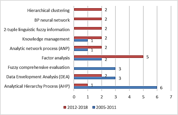 De otro lado, en los últimos años los investigadores están buscando nuevas alternativas metodológicas para medir las capacidades de innovación, por cual materias como evaluación integral difusa, proceso de análisis jerárquico (AHP) y análisis envolvente de datos (DEA) están decreciendo. Por último, los temas nacientes o que solo se observan en el segundo periodo de análisis y evidencian la aparición de nuevos mecanismos para medir CIT en diversas áreas del conocimiento, son: