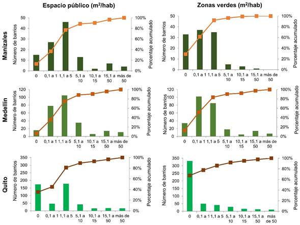 Lo que demuestra la Figura 1 es que la distribución de los espacios públicos por barrio es bastante desigual. De acuerdo con el porcentaje acumulado que indica la línea naranja, en Manizales el del 77 %, esto es, 88 de los 114 barrios analizados tienen menos de 5 m2/hab de EP, de los cuales 15 (13 %) no tienen nada de EP y 27 (24 %) tienen menos de 1 m2/hab. En Medellín la tendencia es similar, con un 74 % (195 de 265) de los barrios con un indicador por debajo de 5 m2/hab; 14 barrios (5,3 %) carecen totalmente de EP y 73 barrios (27,5 %) tienen menos de 1 m2/hab. En Quito la proporción de barrios sin nada de EP alcanza un 26 % (128 de 492), y por debajo de 1 m2/hab se encontraron 57 barrios (11 %), para un acumulado de 74 % (365 de 492 barrios) con un indicador de 5 m2/hab o menos. La distribución barrial de las zonas verdes es más o menos similar a la descrita en Manizales y en Medellín, pero en Quito es claro que la concentración de estos espacios es muchísimo mayor: solo unos pocos sectores de la ciudad tienen generosas extensiones de ecoparques y de zonas verdes, mientras que la gran mayoría de los barrios carecen de ellas (figuras 2, 3 y 4).