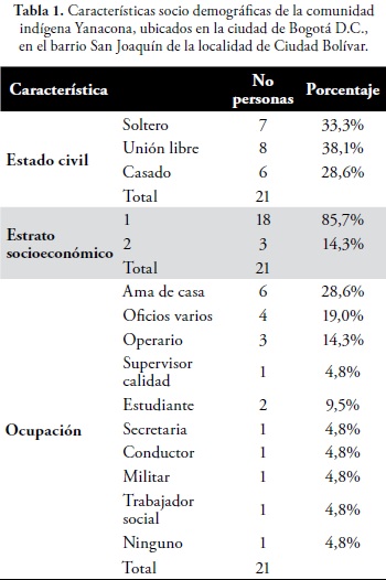 En la capital residen unas 79 familias indígenas, aproximadamente unas 200 personas que habitan en las localidades de Rafael Uribe, Bosa, Suba y Ciudad Bolívar (3). Para el presente estudio se contó con el permiso del Gobernador de la comunidad para trabajar solo con la población de la localidad de Ciudad Bolívar en el barrio San Joaquín, que aproximadamente reúne 40 personas mayores de edad, de estas 21 personas aceptaron participar en el estudio, asistieron el día de la toma de muestra y se les aplico la encuesta. La población se componía en un 52,4% en hombres y un 47,6% en mujeres. El promedio de edad fue de 31 años. Otras características socio demográficos se presentan en la tabla 1.