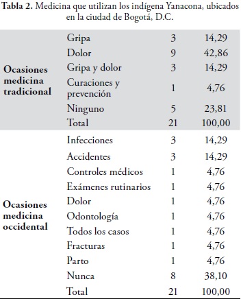 En la población indígena se encontró que la mayoría están afiliados al sistema de seguridad social, y pertenecen al régimen contributivo, ya que son trabajadores. Solo el 23,8% de la comunidad refiere que por el hecho de ser indígena se ha sentido discriminada en la atención de salud. Por el tipo de comunidad surge el interrogante .Que tipo de medicina utilizan con más frecuencia?, el resultado obtenido fue que la mayoría utiliza la medicina tradicional como se presenta en la tabla 2.