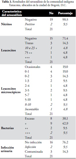 Los resultados del uroanálisis se pueden observar en la tabla 3, de los cuales dos personas presentaron infección urinaria.