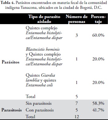 Los parásitos encontrados: Blastocistis hominis, Complejo Entamoeba hystolitica/ Entamoeba dispar, quistes de Giardia intestinalis y quistes de Entamoeba coli, pertenecientes al grupo de protozoarios, predominaron en la comunidad Yanacona, lo que coincide con los datos obtenidos por Devera (8) que encontró prevalencia por Blastocistis hominis y Entamoeba coli en la población Yakariyene de Venezuela, y con Rivero Z, et al, (7) que encontró las mismas especies más el Complejo Entamoebahystolitica/ Entamoeba dispar en la comunidad Japreria de Venezuela.