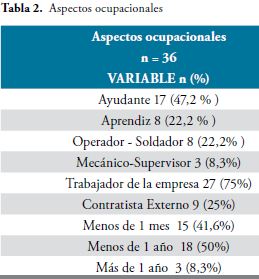 Correspondiente a la tabla 2 referido de aspectos ocupacionales, se observa que la antigüedad promedio de los afectados en la empresa al momento del accidente fue de 7 meses. Los cargos afectados por accidentes de trabajo son ayudante 47.2% (17 de 36); aprendiz y operador-soldador 22.2% (8 de 36) respectivamente, mientras el cargo de mecánico supervisor con 8.3% (3 de 36) obtuvo la menor prevalencia. Resalta que el 75% (27 de 36) de los accidentes ocurrieron a trabajadores de la empresa, mientras 25% (9 de 36) eran contratistas. De los afectados 50% (18 de 36) fueron trabajadores que tenían menos de un año laborando en la empresa, mientras 15 de estos (41.6%) tenían menos de un mes y sólo 8.3% (3 de 36) tenían más de un año de labores en la organización.