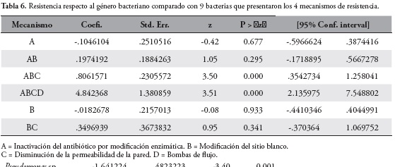 Respecto a la evaluación del comportamiento que está presentando la resistencia generada por la enzima, al realizar la regresión lineal de acuerdo al género bacteriano, los datos fueron evaluados frente a la resistencia que presenta el género Klebsiella dado que este género en la revisión es el que mayor número de casos presenta. De acuerdo con los resultados mostrados en la Tabla 5, el género y Leclercia (P-valor < 0.001) sobresale dado que presenta una resistencia mayor a Klebsiella en 4.03 antibióticos (aunque este no puede generar inferencia debido al bajo número de reportes); otros géneros bacterianos presentan una resistencia menor respecto a Klebsiella como: Pseudomonas (P-valor < 0.001) menor en -1.6 y Salmonella (P-valor < 0.001) menor en -2.1, Tabla 5.