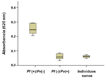 La metodología usada nos permite identificar respuestas inmunes especie-específicas, en particular, se puede diferenciar la respuesta inmune contra P. falciparum de la respuesta inmune contra P. vivax21. Los resultados permiten concluir que los dos antígenos utilizados (extracto proteico, péptido sintético) son útiles para la detección de IgG específica para P. falciparum, por las diferencias significativas evidentes entre las densidades ópticas obtenidas con los sueros de los pacientes diagnosticados por P. falciparum y los sueros de pacientes diagnosticados con P. vivax.