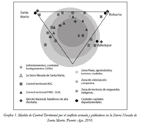 En la SNSM, el territorio de los pueblos indígenas se ha vuelto objeto de conflicto, dado que grupos armados y narcotraficantes se disputan su dominio y control. Las guerrillas y los paramilitares han afectado la gobernabilidad de los pueblos indígenas; la entrada a la SNSM de las Fuerzas Armadas Revolucionarias de Colombia-FARC a mitad de la década de los ochenta llevó al asentamiento de esta guerrilla en algunas cuencas, posteriormente se consolidó en los noventa con el control de la vertiente occidental de la Sierra. De manera similar llegaron frentes del Ejército de Liberación Nacional-ELN. Estos dos actores armados han realizado acciones en contra de la infraestructura energética y productiva y han combatido al ejército colombiano y la policía.