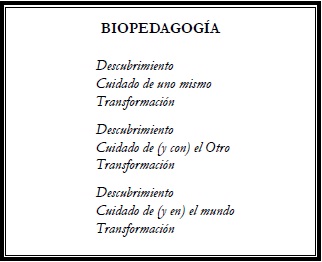 Mediante un diálogo genuino,7 podemos explorar prácticas pedagógicas que nos permitan construir mundo con Otros, dándonos cuenta de dichas prácticas y dejando emerger nuestra afectividad y creatividad. En esta aventura subyace la esencia de la biopedagogía, la cual denota una práctica de descubrimiento, cuidado y transformación de uno mismo, de (y con) el Otro y de (y en) el mundo en el proceso educativo (Romero, 2011a).