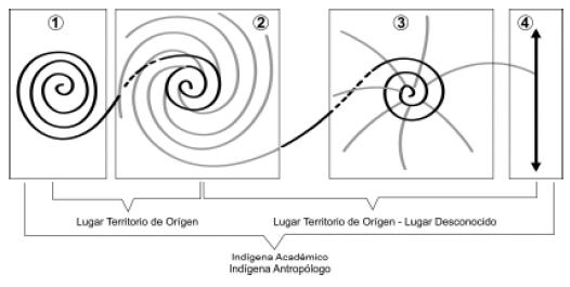 El resultado de la figura se puede leer: (1) Territorio de origen es el lugar donde se funda el pensamiento indígena, esa gestación se desplaza hacia (4) otro lugar desconocido que suponemos es donde reside lo no-propio. Durante el desplazamiento se producen dos lugares intermedios, así (2) es el lugar donde los jóvenes indígenas experimentan un primer abandono de su territorio, no obstante, siguen manteniendo los principios fundacionales de su cultura. Los que llegan al lugar intermedio, donde (3) son los indígenas que a pesar de mantener su identidad cultural chocan, se dejan consumir por lo extraño (lo lineal, cartesiano, estereotipos, la urbe, teorías), en caso contrario, al chocar, el indígena regresa a su territorio de origen al no poder afrontar tal choque; pero aquellos que logran sortear o nadar en esas aguas cartesianas y el mundo urbano, está en un constante ir y venir, de allí que la dualidad se flexibiliza o dejar de ser, pasa a un segundo plano y se vuelve diverso la condición del ser del indígena como antropólogo. El lector crítico de esta propuesta dirá, que no necesariamente el desplazamiento de allá para acá y de acá para allá del indígena generaría dichos efectos, sino que también las posturas radicales perduran tanto adentro como afuera del interior de los territorios de origen. Que en efecto, la gama de diversas posturas son interdependientes y no están ni afuera ni adentro sino en la forma de la lógica de un pensamiento en espiral y no segmentaría como podría ser leído la anterior figura.