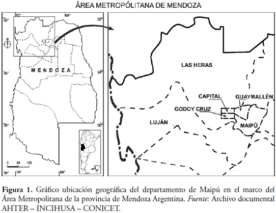 Maipú es uno de los seis departamentos que integran el Área Metropolitana de la provincia de Mendoza, Argentina. Tiene una extensión de 717 km2, y se encuentra dividido en 12 distritos; la población total, según Censo 2002, es de 157.851 habitantes. Se ubica a 68 grados 56 minutos longitud oeste y a 32 grados 59 minutos de latitud sur, a una altura de 804 metros sobre el nivel del mar, cuya ubicación geográfica la podemos observar en la figura 1.