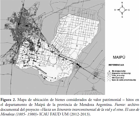 9 En el marco del proyecto dirigido por Liliana Girini, perteneciente al Instituto de Cultura Arquitectónica y Urbana (ICAU) de la Facultad de Arquitectura Urbanismo y Diseño (FAUD) de la Universidad de Mendoza (UM) titulado "Hacia una ruta intercontinental de la vid y el vino. El caso de Mendoza (1885 - 1980)" se detectaron un total de 167 componentes- hitos relevantes para la lectura del carácter del paisaje del departamento Maipú