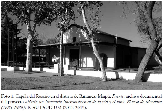 De estas etapas principales, específicamente en el departamento de Maipú, hacia el siglo XVI las tierras desérticas pertenecían a las poblaciones indígenas Huarpes, cuyos restos arqueológicos de los asentamientos fueron encontrados en las localidades del departamento como en Rodeo del Medio, Lunlunta, Fray Luis Beltrán y Barrancas entre otros, ver (Fotos 1 y 2). Posteriormente con la llegada de los españoles se introdujo en el territorio construcciones para la subsistencia y evangelización, de esta etapa la capilla del Rosario en Barrancas, que fue construida por los Doctrineros, es testimonio en pié, ver (Foto 1).